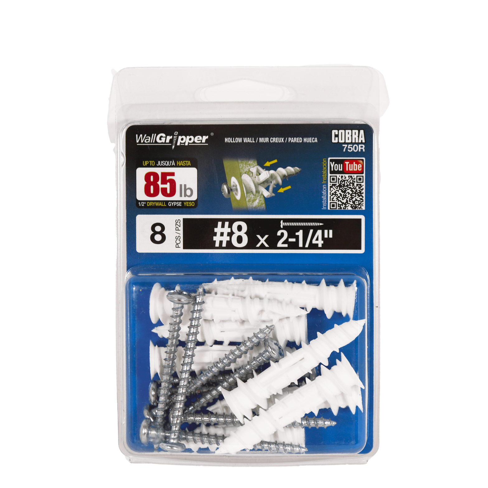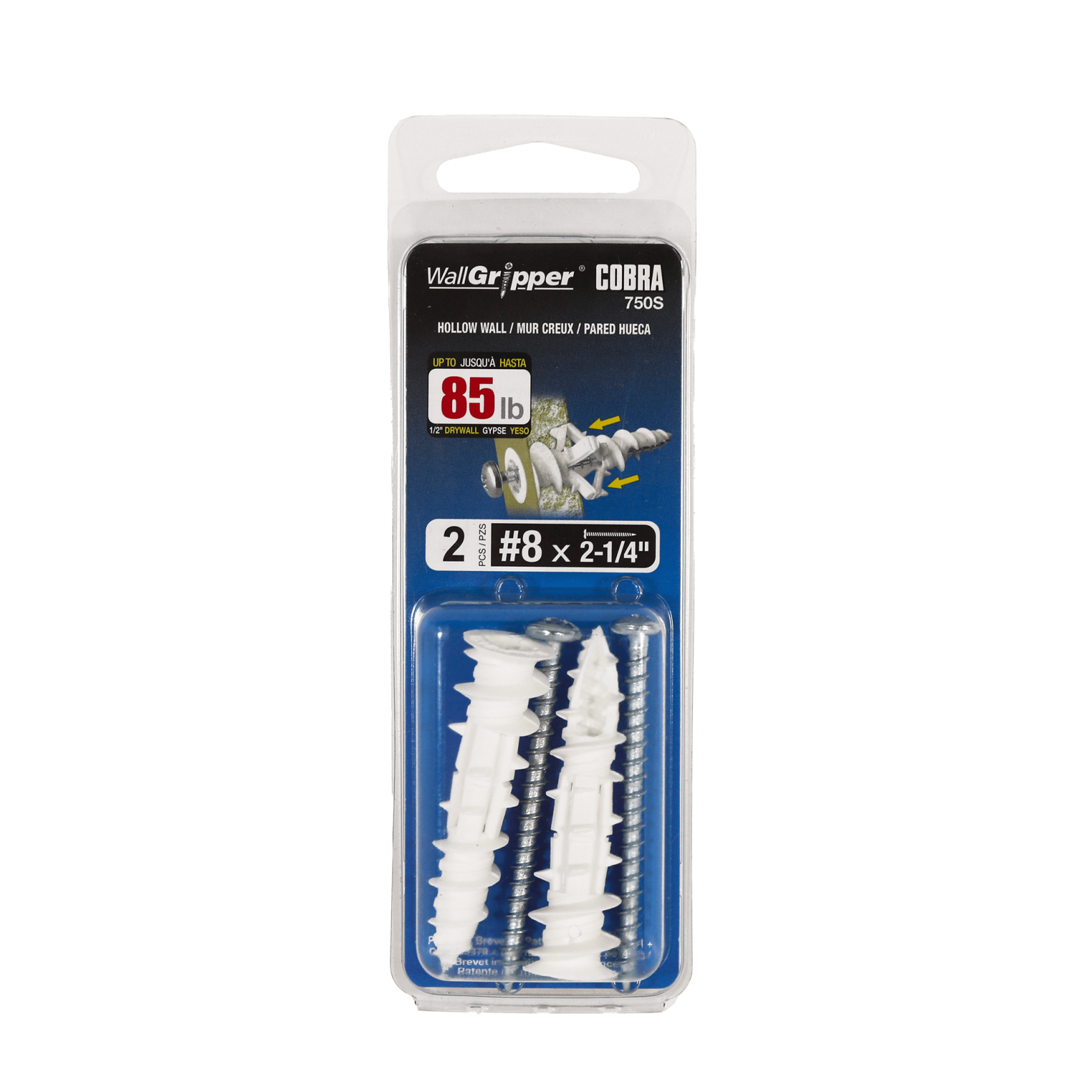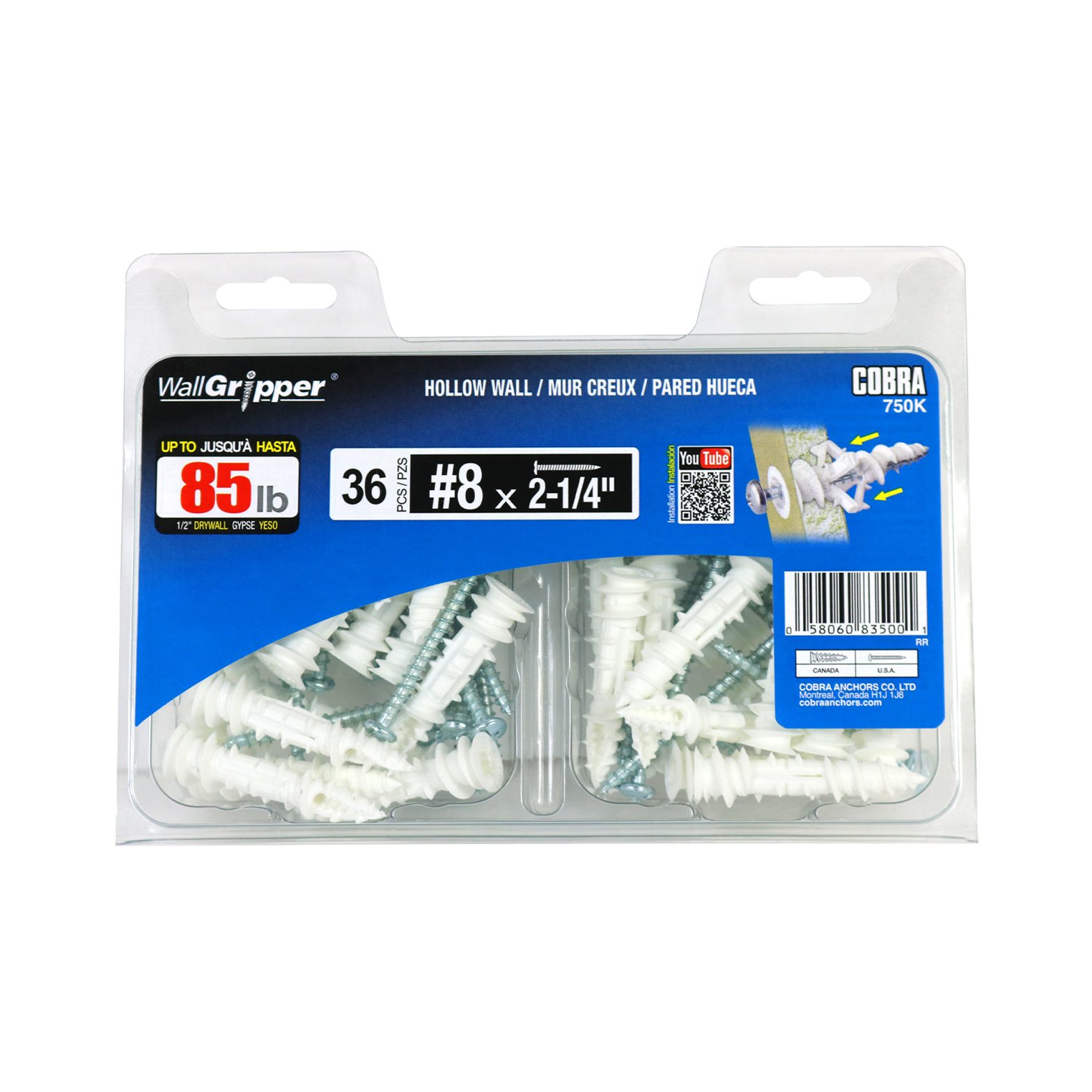 Le WallGripper est un ancrage autoforeux à expansion haute-performance compatible avec le placoplâtre. Il s’ouvre, s’agrippe derrière le gypse et est deux fois plus résistant qu’un ancrage autoforeur courant. Son design breveté vous assure d’une capacité de retenue ultime sans préperçage. Son corps de conception unique possède quatre ailettes d’expansion qui se rabattent et s’agrippent fermement derrière le gypse. Une fine pointe centrée guide l’ancrage dans le mur avec une parfaite précision. Une bordure acérée réduit la force requise pour couper le matériau. Un filet au profil acéré coupe profondément dans le trou pour assurer une capacité ultime de retenue et de stabilité sans endommager le matériau du mur.