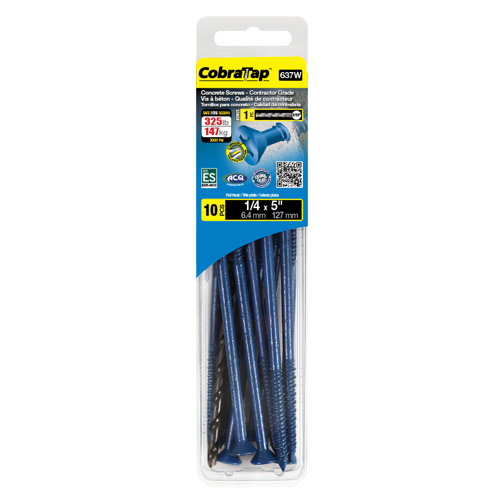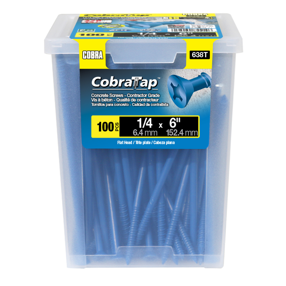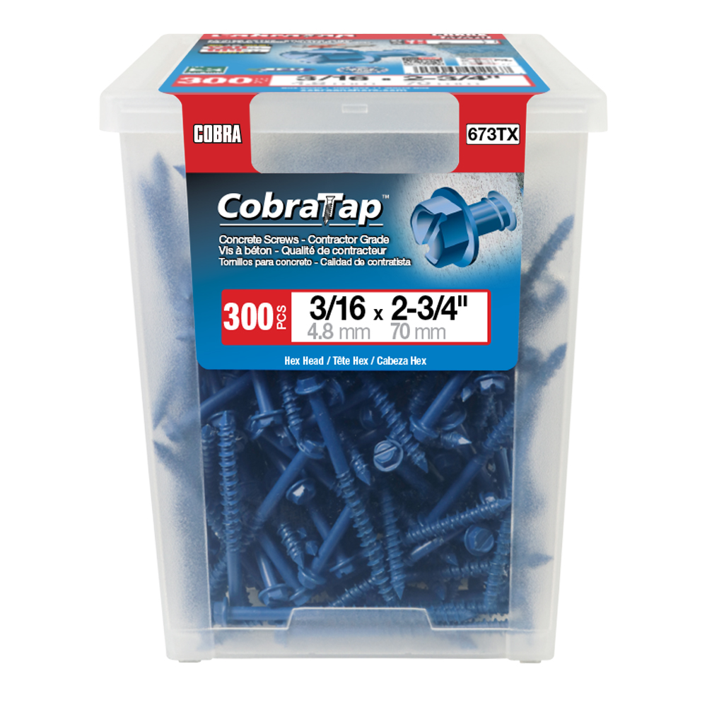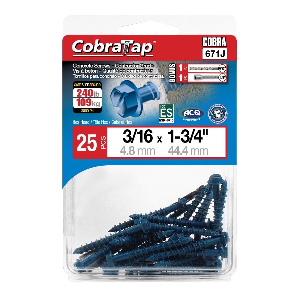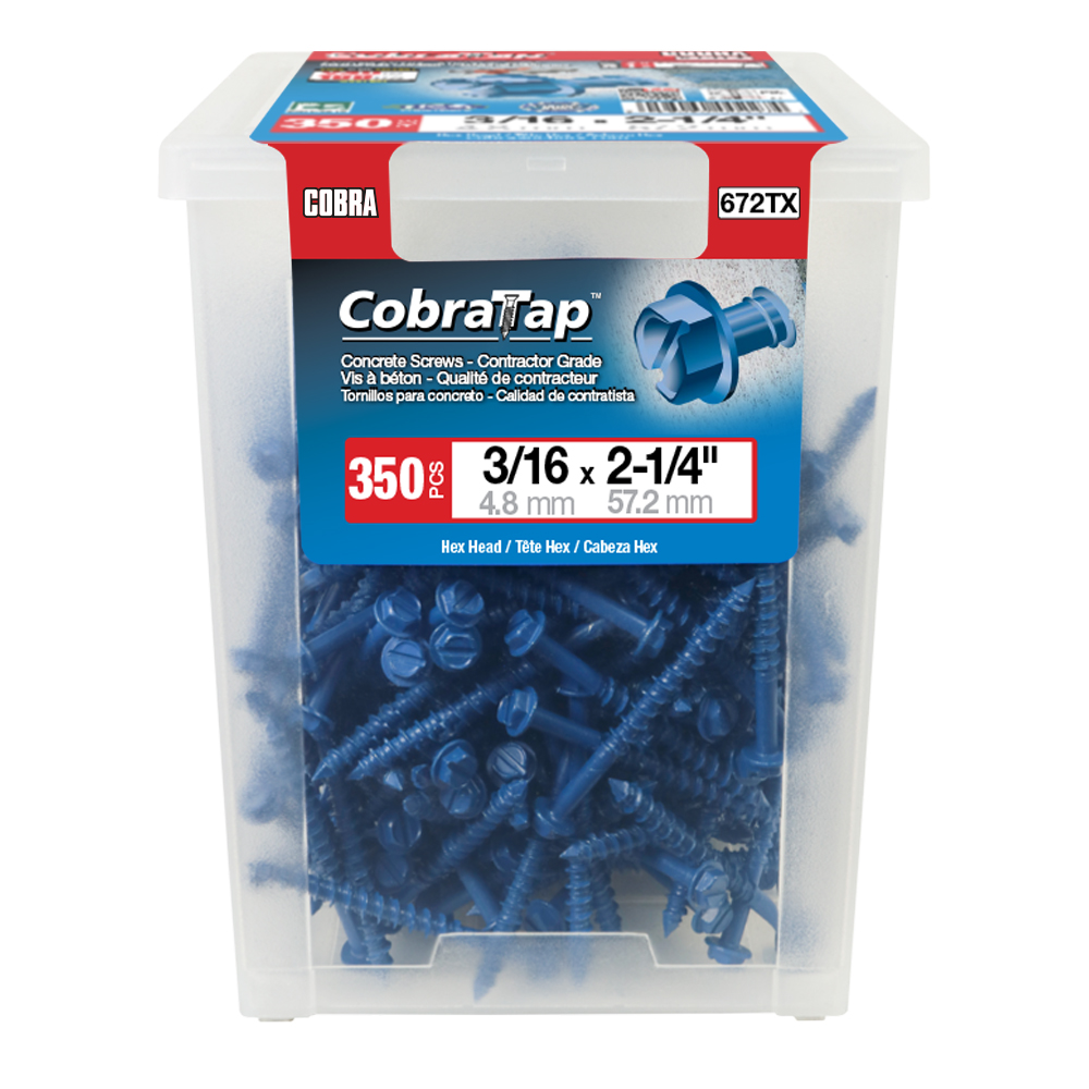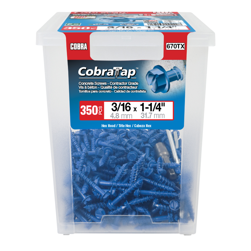 The CobraTap™ concrete screws are designed with a high and low thread to cut the concrete more effectively and to keep its alignment. It is made of tempered, high grade steel to ensure the best torque and maximum holding power and is coated with the corrosion resistant Cobra Coat™. The CobraTap™ is ICC-ES approved, ACQ compatible and is offered with a flat or a hexagonal head. The hexagonal head style contains a BONUS drill bit in the 10-piece pack, while a drill bit and socket drive are included in packs of 25 and 100 pieces. The hexagonal head concrete screws are available in sizes ranging from 3/16″ x 1-1/4″ to 1/4″ x 5″. Available in 3 colors: White, Black and Blue.