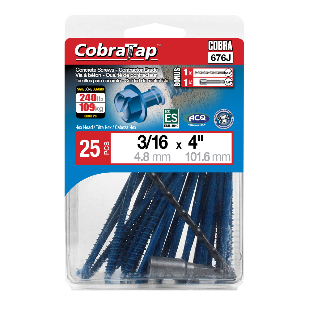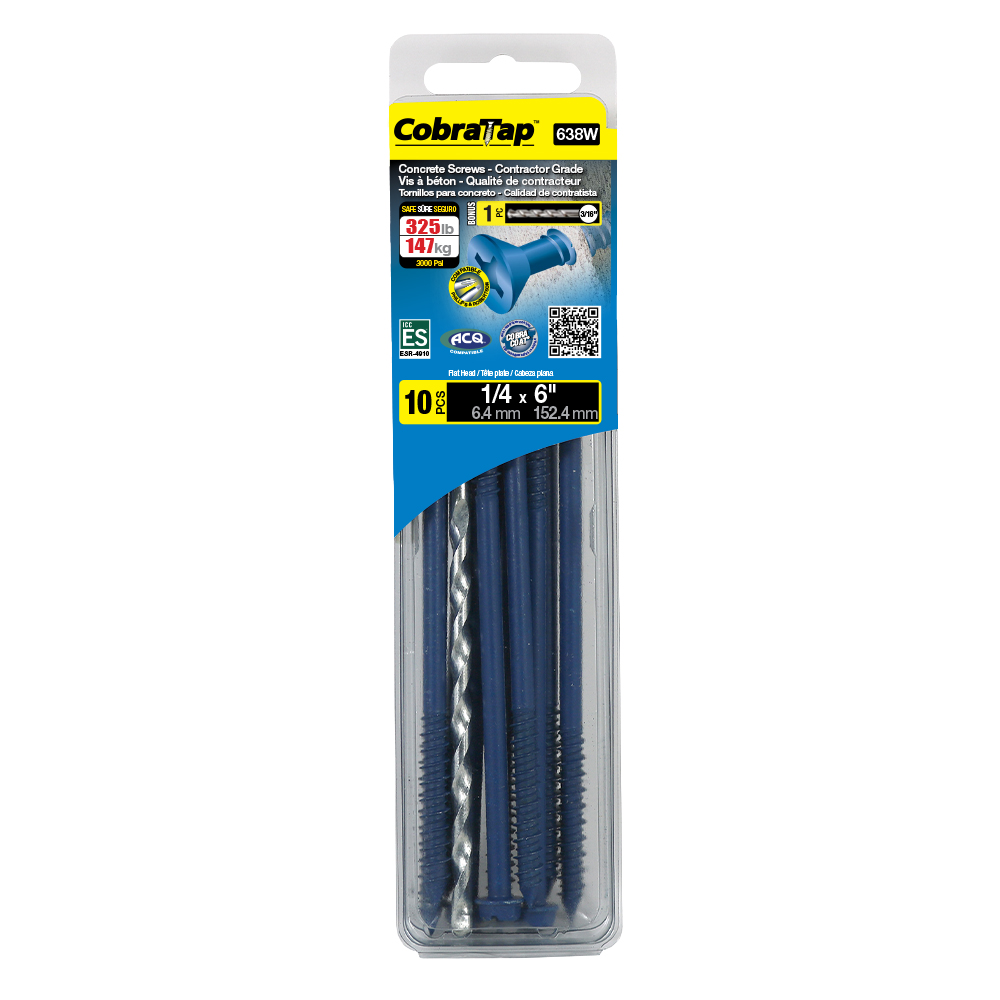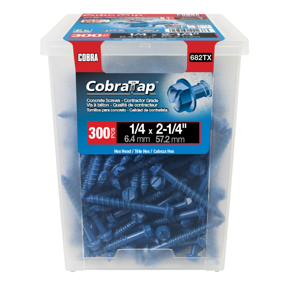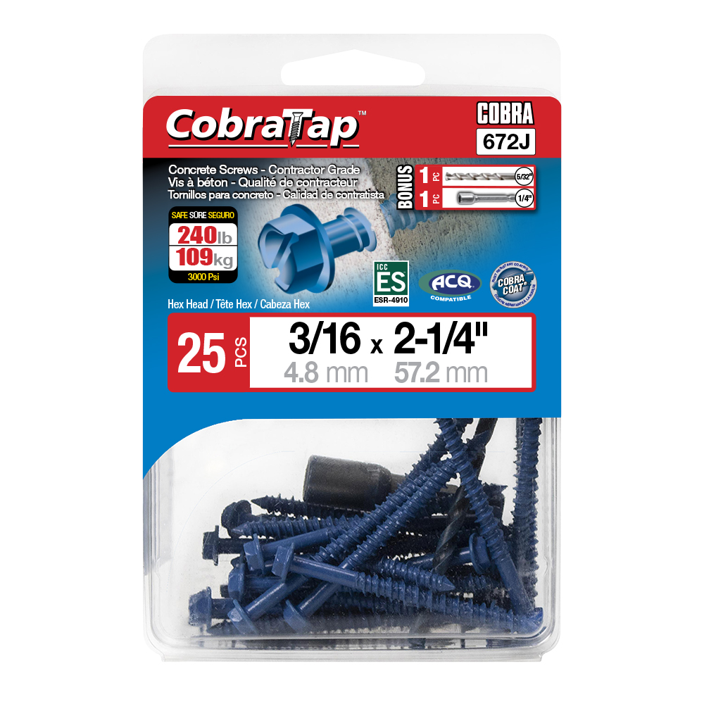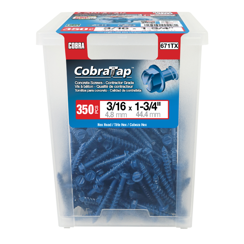 The CobraTap™ concrete screws are designed with a high and low thread to cut the concrete more effectively and to keep its alignment. It is made of tempered, high grade steel to ensure the best torque and maximum holding power and is coated with the corrosion resistant Cobra Coat™. The CobraTap™ is ICC-ES approved, ACQ compatible and is offered with a flat or a hexagonal head. The hexagonal head style contains a BONUS drill bit in the 10-piece pack, while a drill bit and socket drive are included in packs of 25 and 100 pieces. The hexagonal head concrete screws are available in sizes ranging from 3/16″ x 1-1/4″ to 1/4″ x 5″. Available in 3 colors: White, Black and Blue.