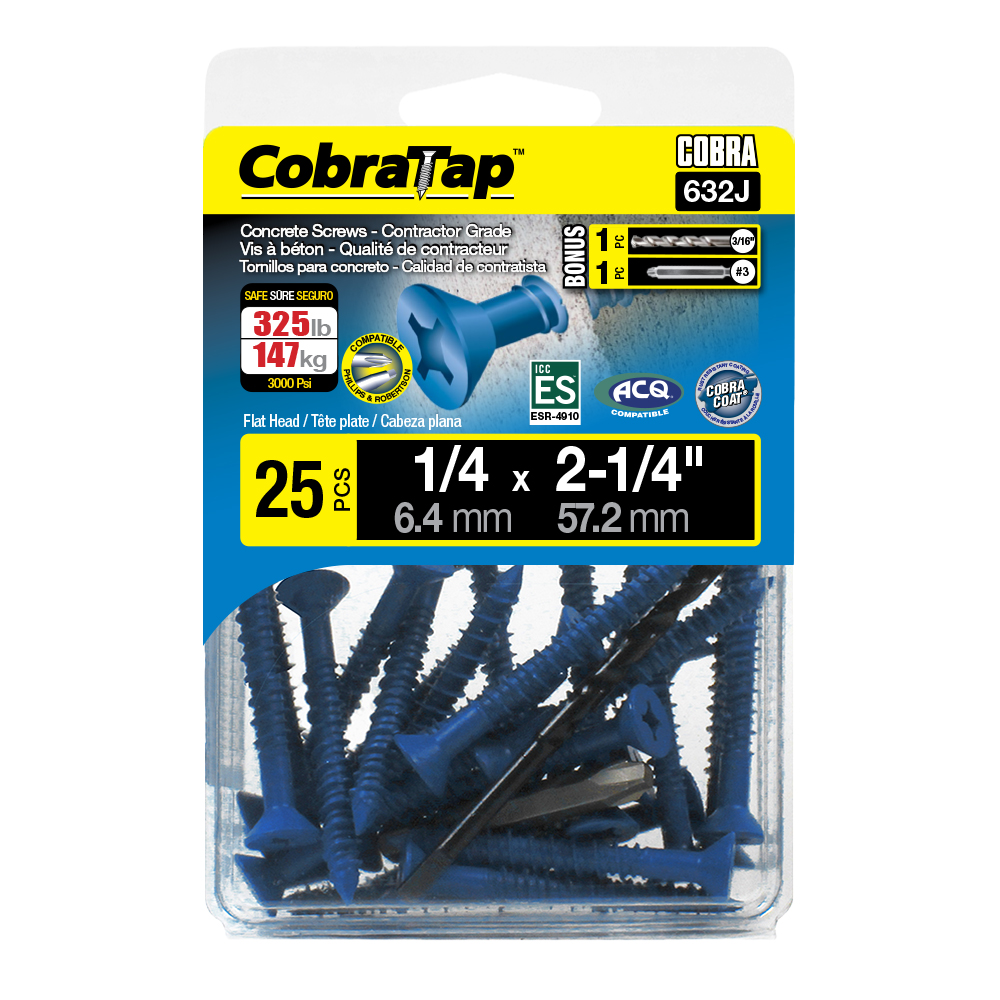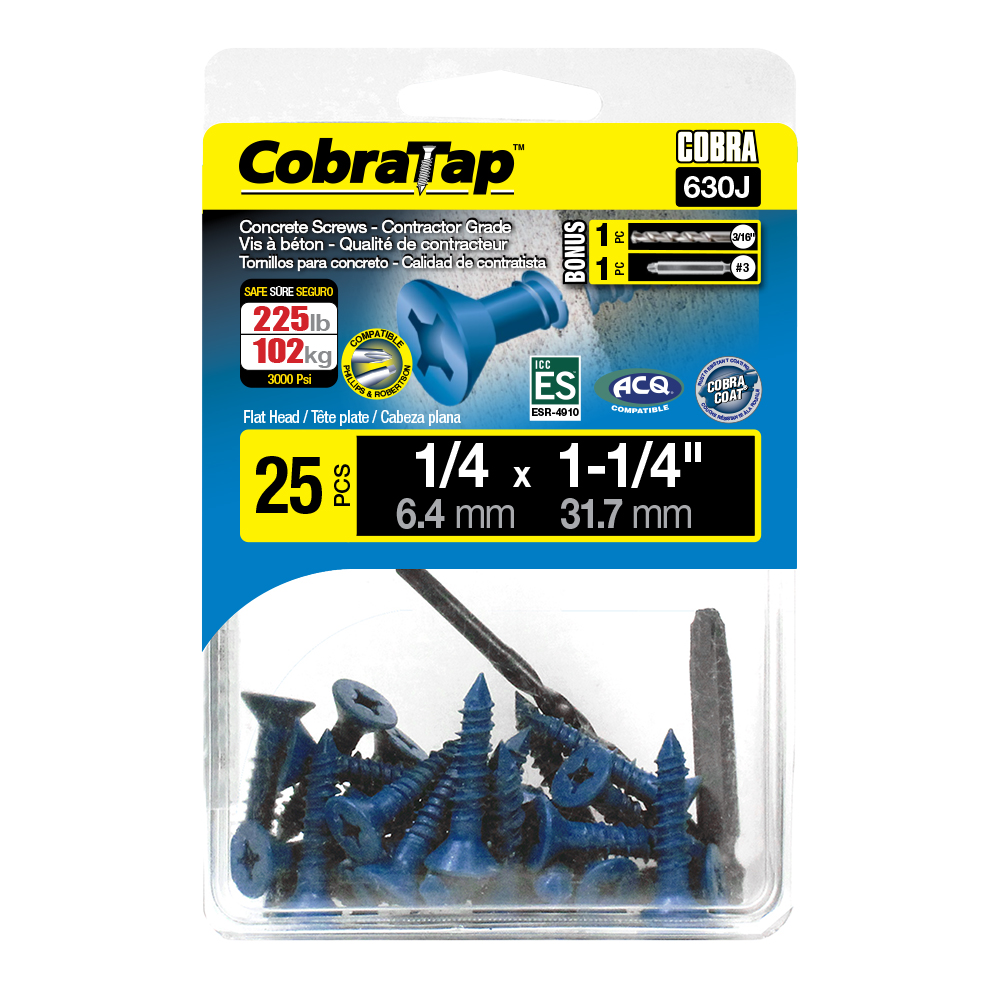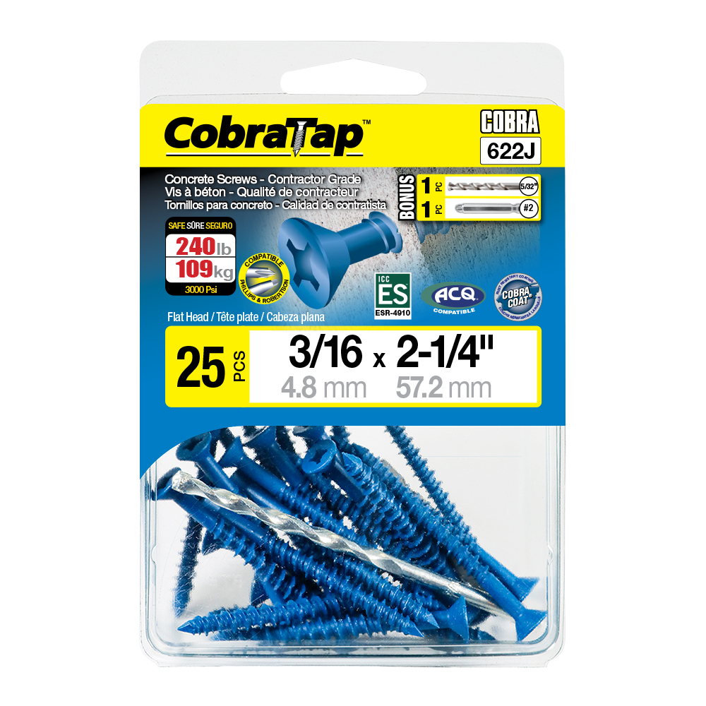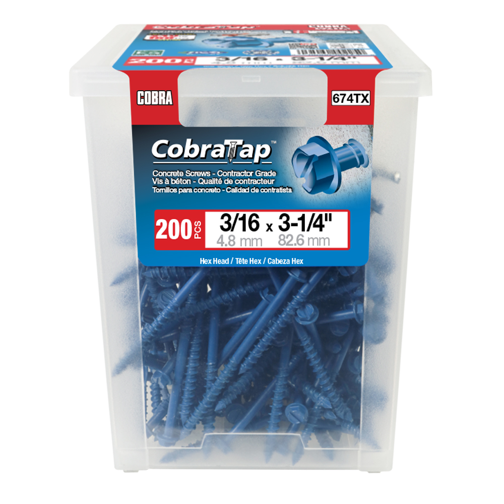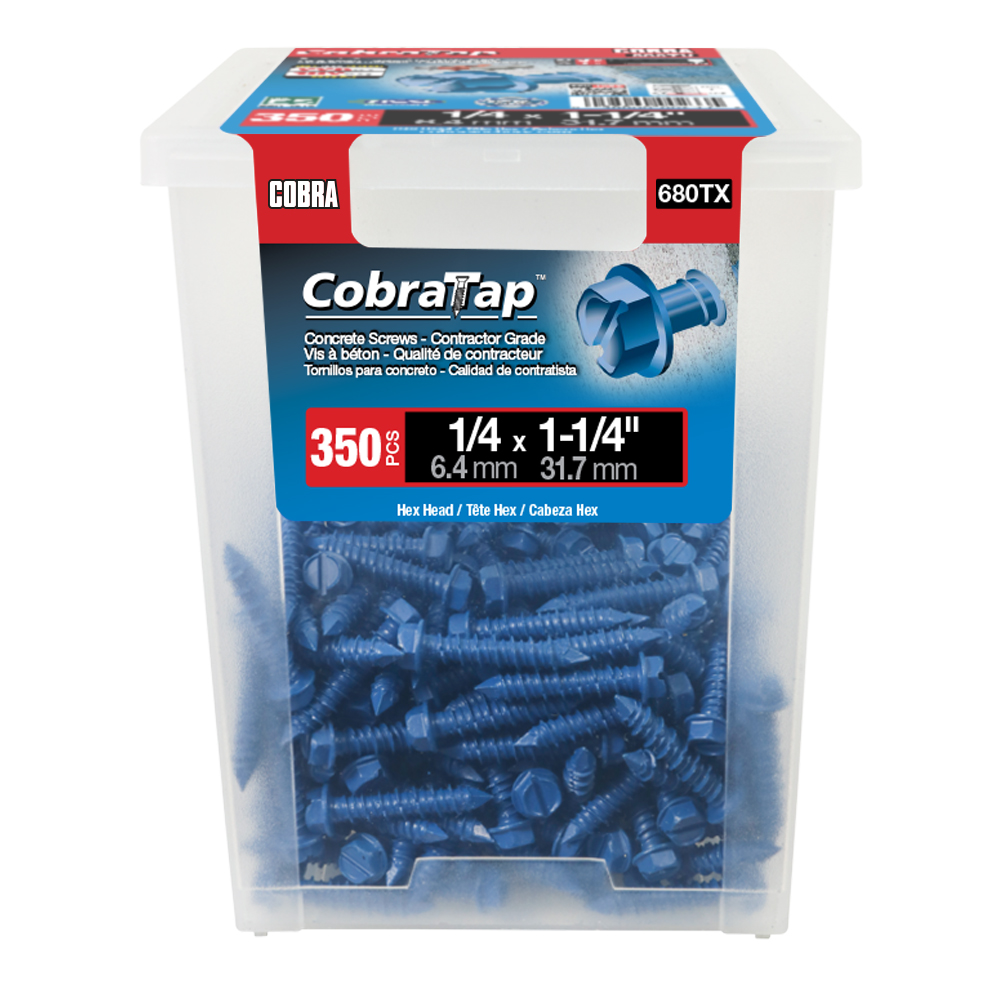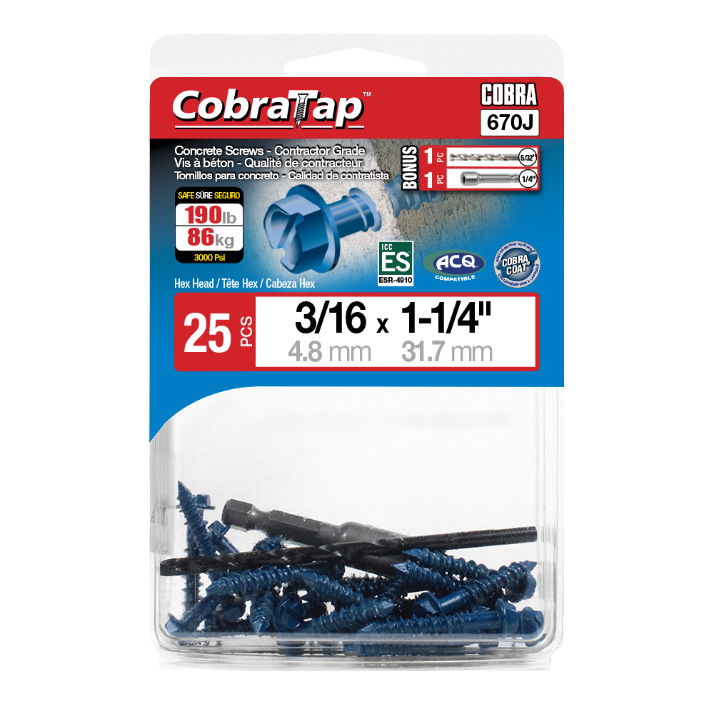 The CobraTap™ concrete screws are designed with a high and low thread to cut the concrete more effectively and to keep its alignment. It is made of tempered, high grade steel to ensure the best torque and maximum holding power and is coated with the corrosion resistant Cobra Coat™. The CobraTap™ is ICC-ES approved, ACQ compatible and is offered with a flat or a hexagonal head. The hexagonal head style contains a BONUS drill bit in the 10-piece pack, while a drill bit and socket drive are included in packs of 25 and 100 pieces. The hexagonal head concrete screws are available in sizes ranging from 3/16″ x 1-1/4″ to 1/4″ x 5″. Available in 3 colors: White, Black and Blue.