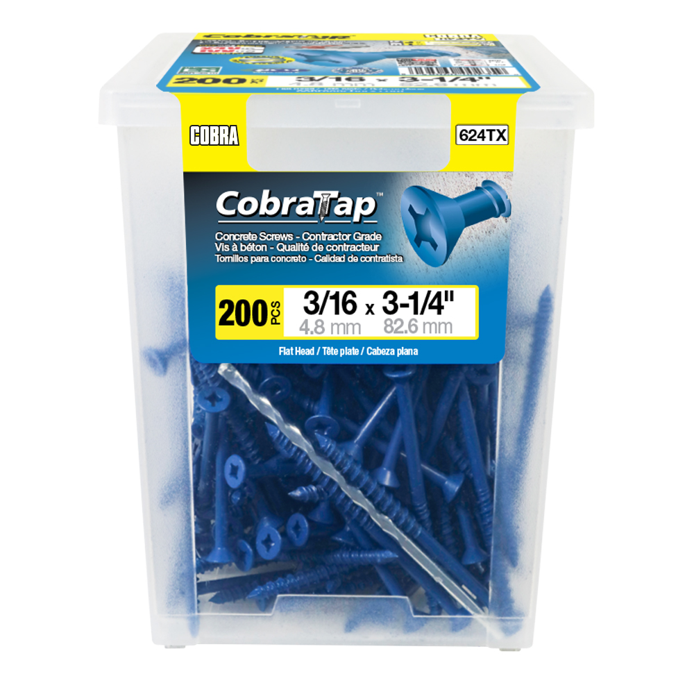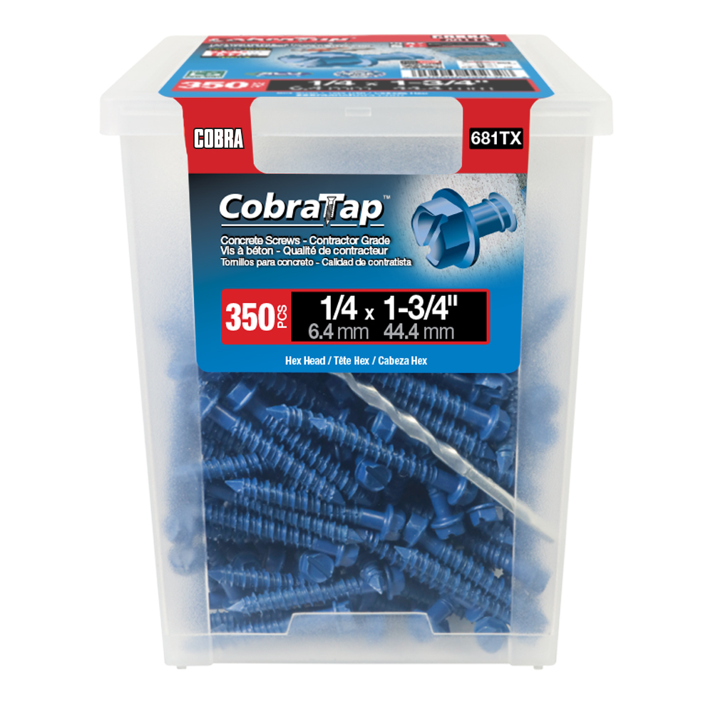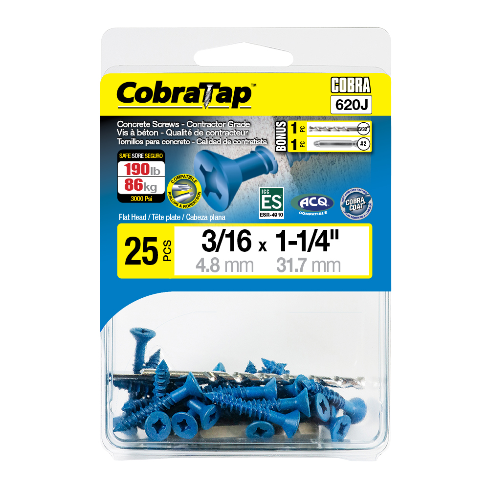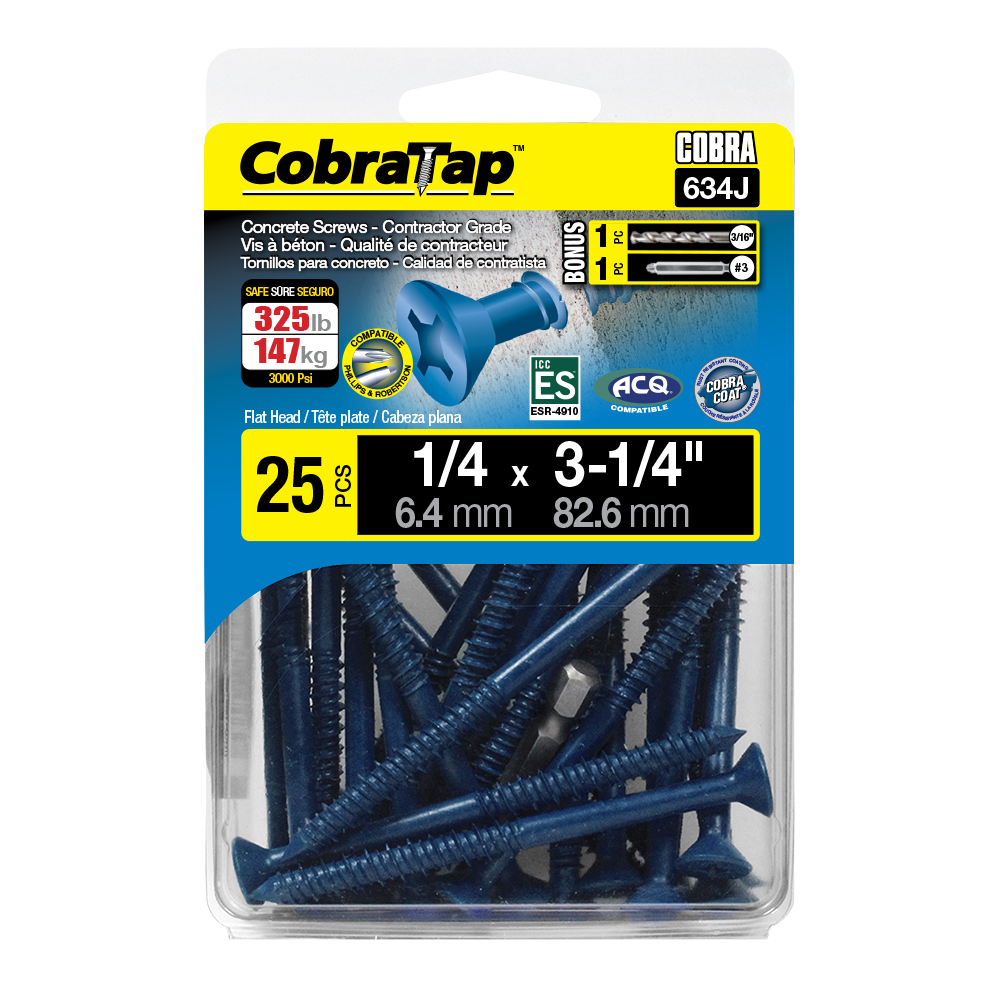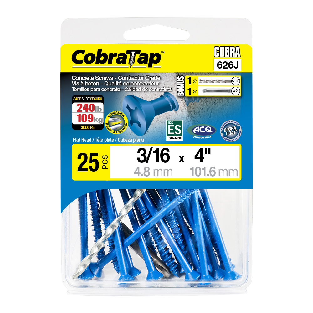 The CobraTap™ concrete screws are designed with a high and low thread to cut the concrete more effectively and to keep its alignment. It is made of tempered, high grade steel to ensure the best torque and maximum holding power and is coated with the corrosion resistant Cobra Coat™. The CobraTap™ is ICC-ES approved, ACQ compatible and is offered with a flat or a hexagonal head. The hexagonal head style contains a BONUS drill bit in the 10-piece pack, while a drill bit and socket drive are included in packs of 25 and 100 pieces. The hexagonal head concrete screws are available in sizes ranging from 3/16″ x 1-1/4″ to 1/4″ x 5″. Available in 3 colors: White, Black and Blue.