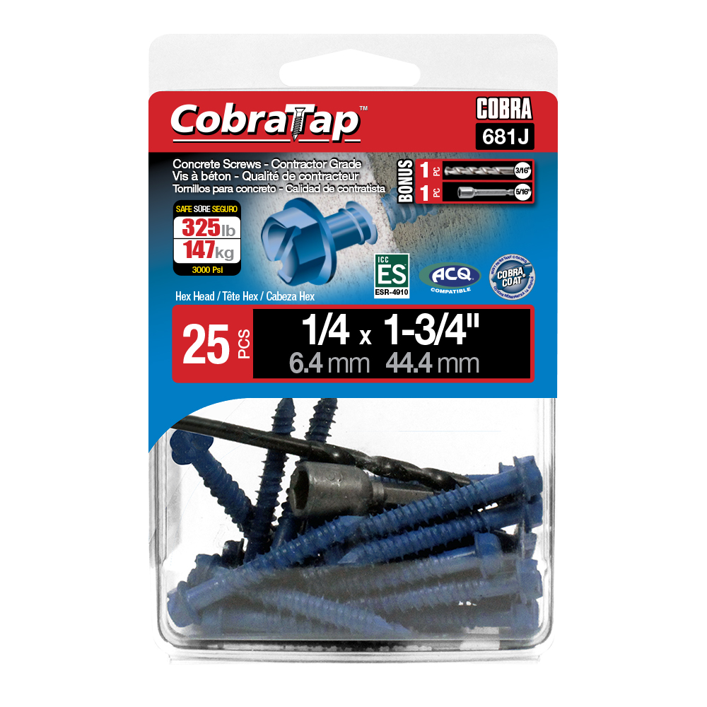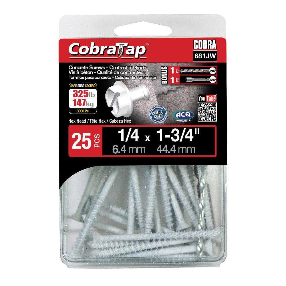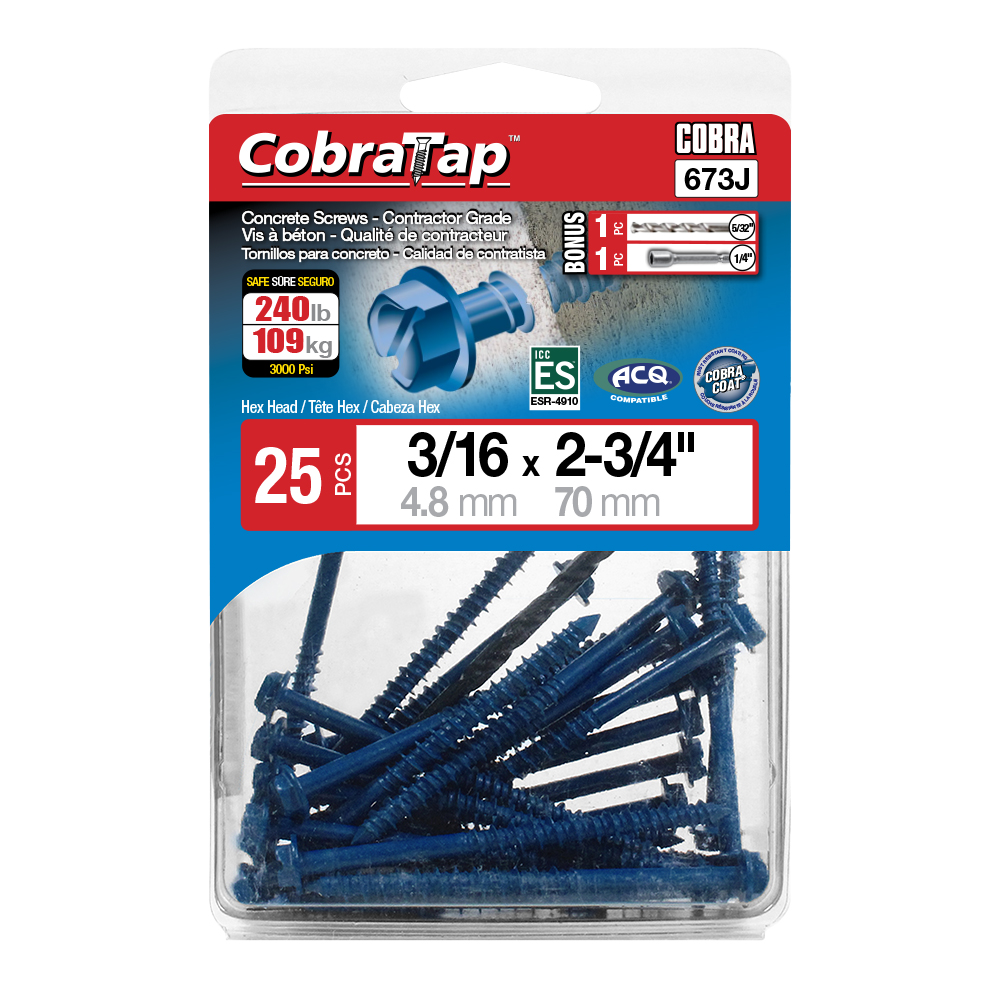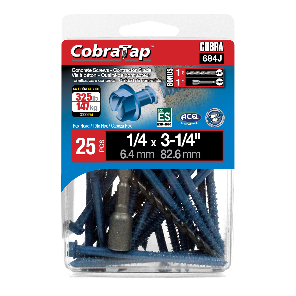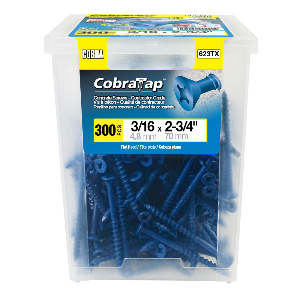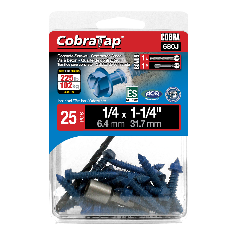 The CobraTap™ concrete screws are designed with a high and low thread to cut the concrete more effectively and to keep its alignment. It is made of tempered, high grade steel to ensure the best torque and maximum holding power and is coated with the corrosion resistant Cobra Coat™. The CobraTap™ is ICC-ES approved, ACQ compatible and is offered with a flat or a hexagonal head. The hexagonal head style contains a BONUS drill bit in the 10-piece pack, while a drill bit and socket drive are included in packs of 25 and 100 pieces. The hexagonal head concrete screws are available in sizes ranging from 3/16″ x 1-1/4″ to 1/4″ x 5″. Available in 3 colors: White, Black and Blue.