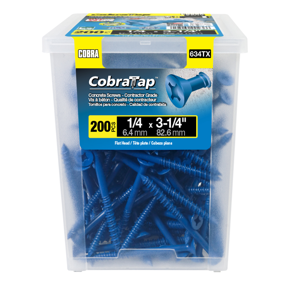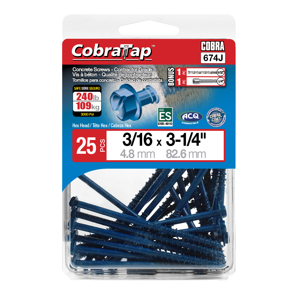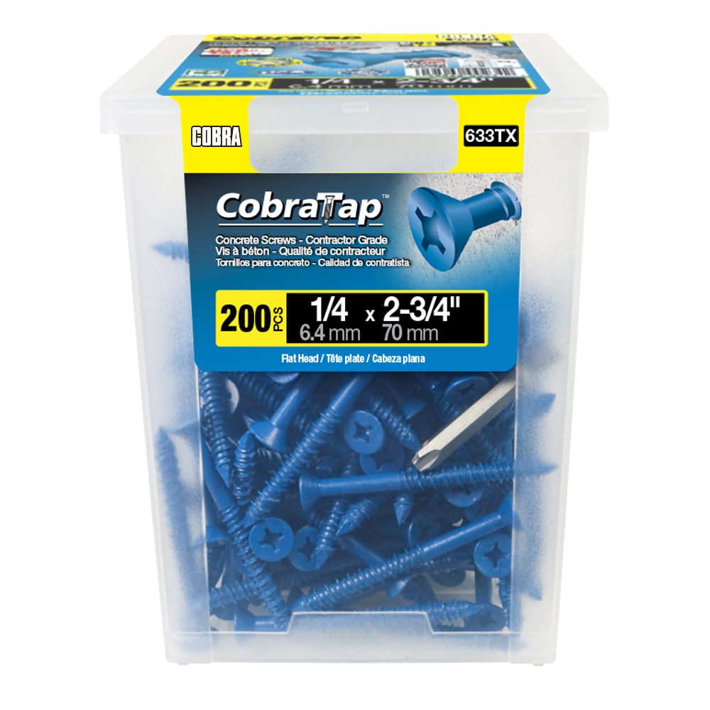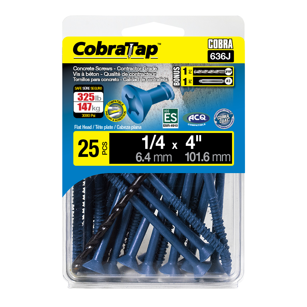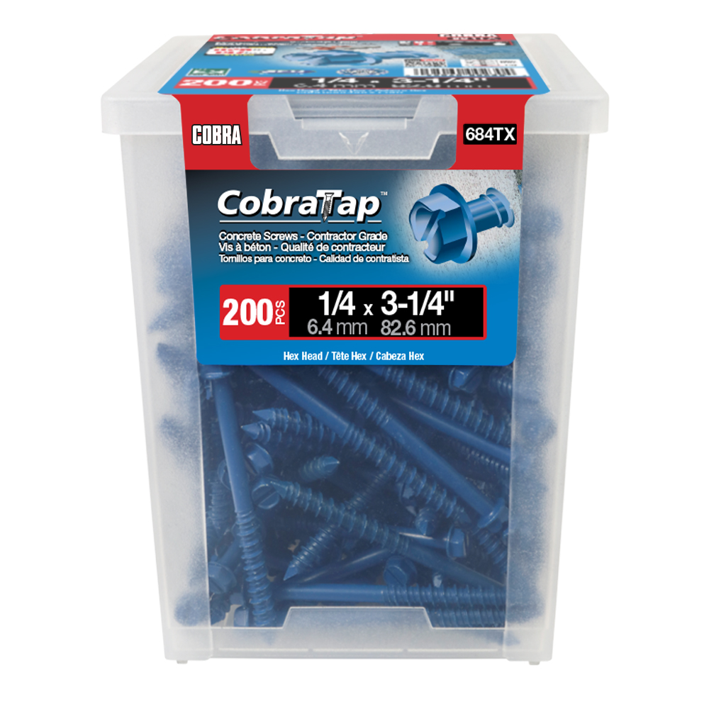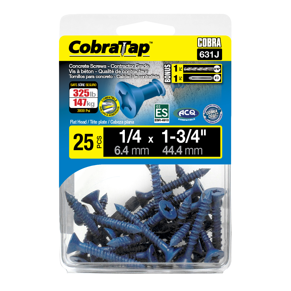 The CobraTap™ concrete screws are designed with a high and low thread to cut the concrete more effectively and to keep its alignment. It is made of tempered, high grade steel to ensure the best torque and maximum holding power and is coated with the corrosion resistant Cobra Coat™. The CobraTap™ is ICC-ES approved, ACQ compatible and is offered with a flat or a hexagonal head. The hexagonal head style contains a BONUS drill bit in the 10-piece pack, while a drill bit and socket drive are included in packs of 25 and 100 pieces. The hexagonal head concrete screws are available in sizes ranging from 3/16″ x 1-1/4″ to 1/4″ x 5″. Available in 3 colors: White, Black and Blue.