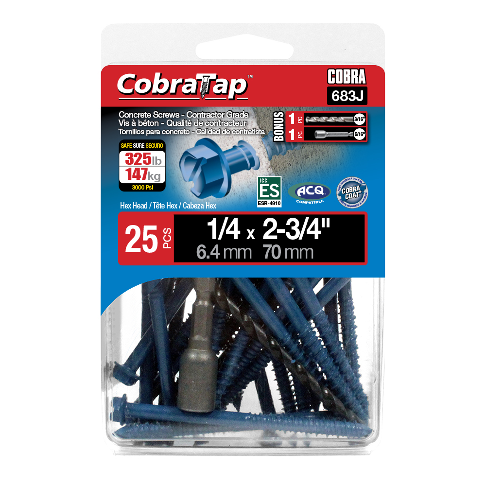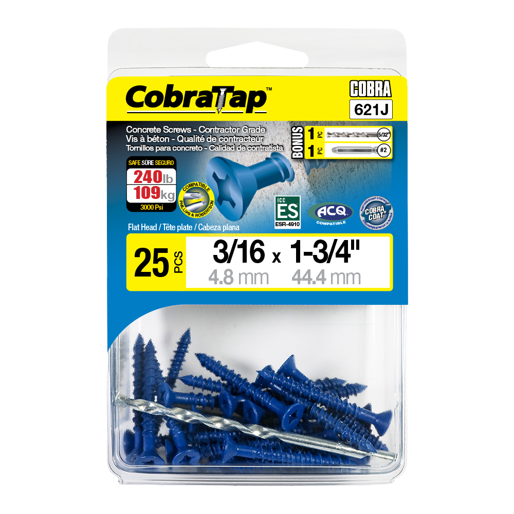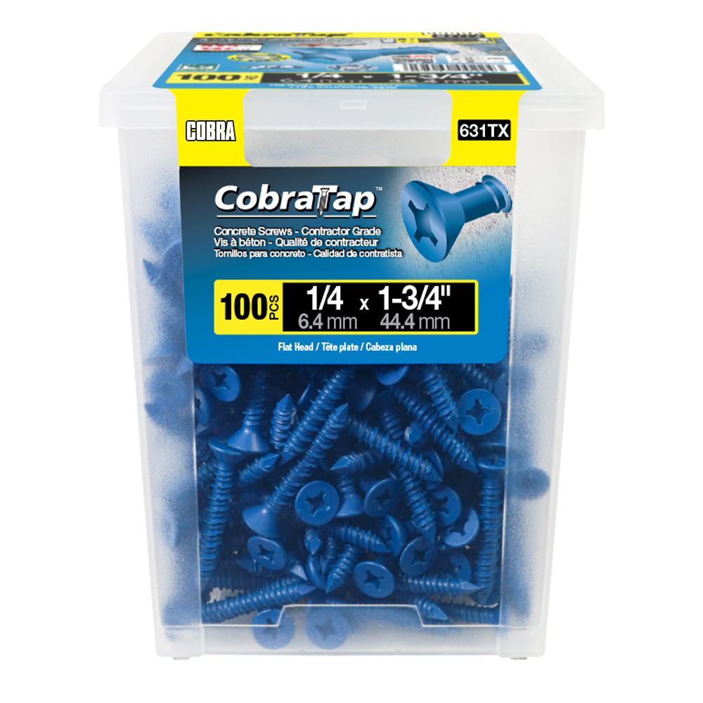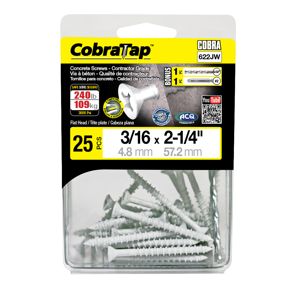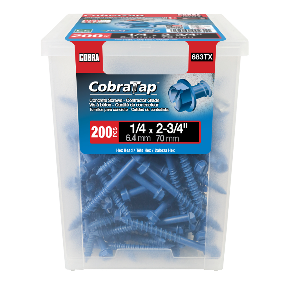The CobraTap™ concrete screws are designed with a high and low thread to cut the concrete more effectively and to keep its alignment. It is made of tempered, high grade steel to ensure the best torque and maximum holding power and is coated with the corrosion resistant Cobra Coat™. The CobraTap™ is ICC-ES approved, ACQ compatible and is offered with a flat or a hexagonal head. The hexagonal head style contains a BONUS drill bit in the 10-piece pack, while a drill bit and socket drive are included in packs of 25 and 100 pieces. The hexagonal head concrete screws are available in sizes ranging from 3/16″ x 1-1/4″ to 1/4″ x 5″. Available in 3 colors: White, Black and Blue.