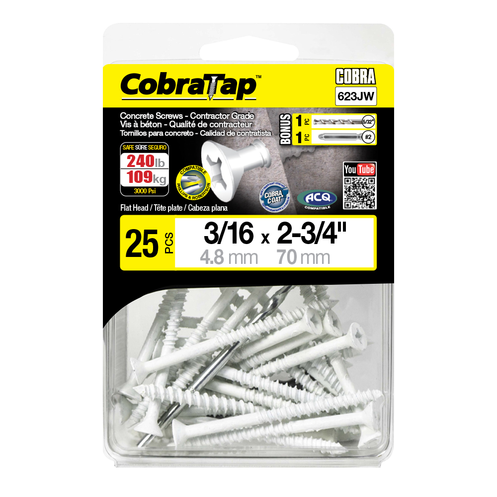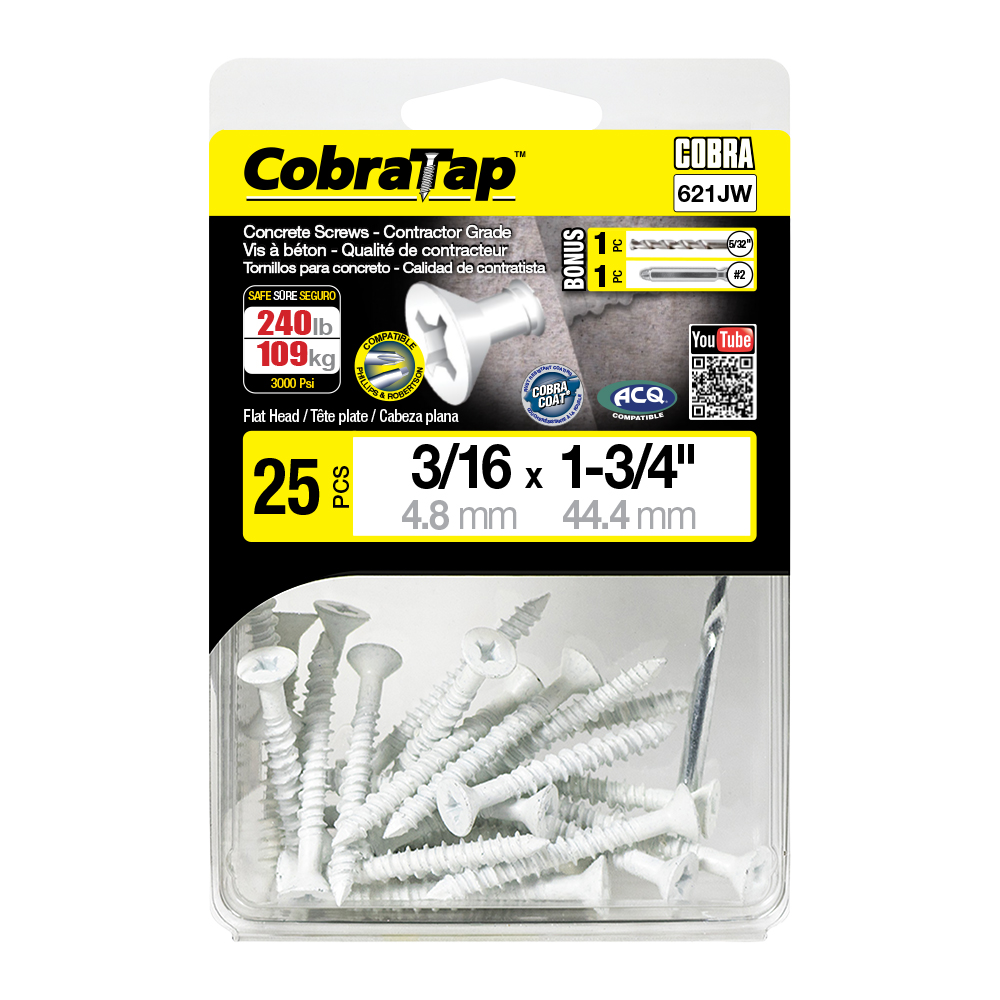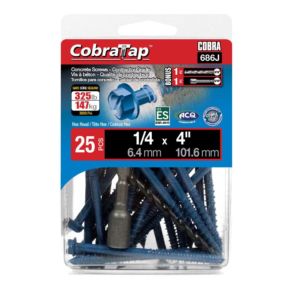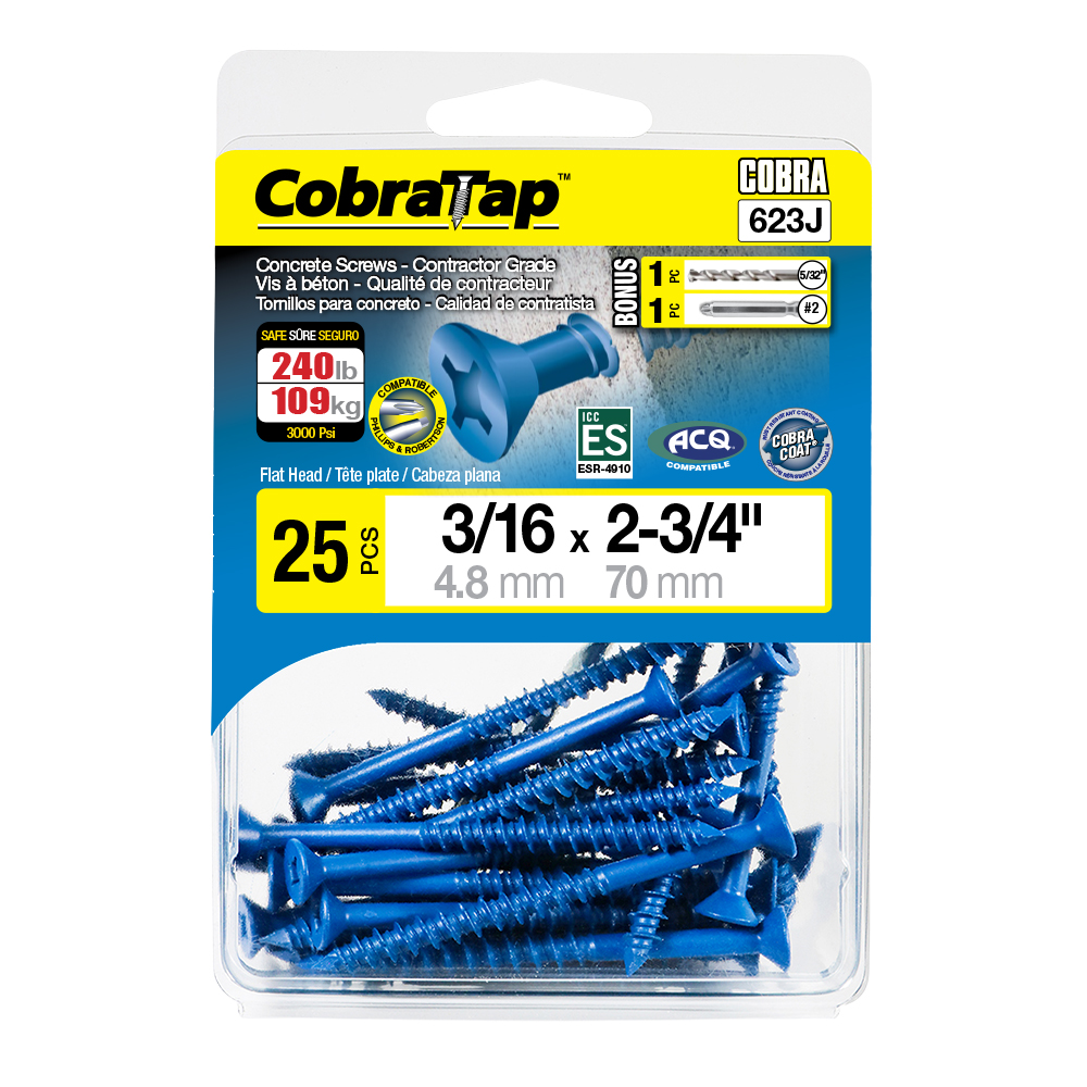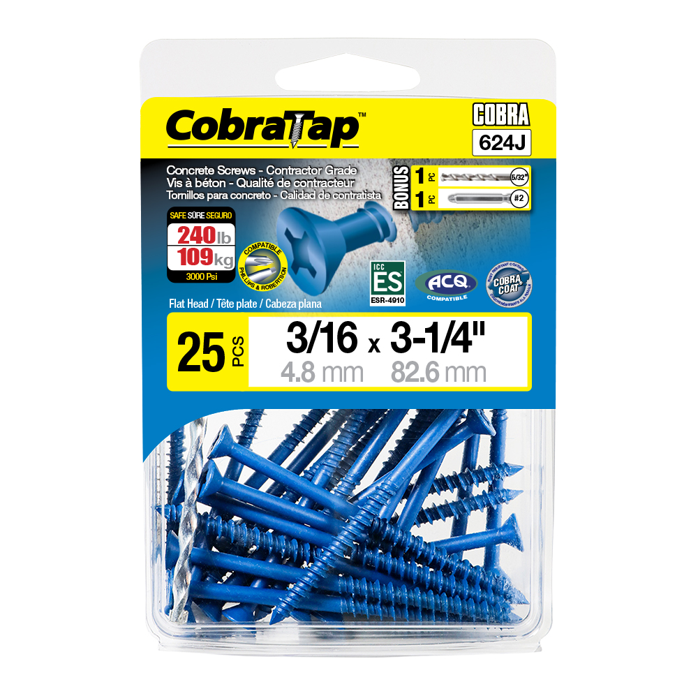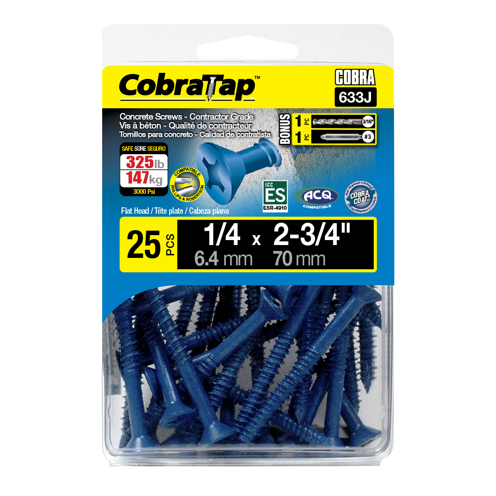 The CobraTap™ concrete screws are designed with a high and low thread to cut the concrete more effectively and to keep its alignment. It is made of tempered, high grade steel to ensure the best torque and maximum holding power and is coated with the corrosion resistant Cobra Coat™. The CobraTap™ is ICC-ES approved, ACQ compatible and is offered with a flat or a hexagonal head. The hexagonal head style contains a BONUS drill bit in the 10-piece pack, while a drill bit and socket drive are included in packs of 25 and 100 pieces. The hexagonal head concrete screws are available in sizes ranging from 3/16″ x 1-1/4″ to 1/4″ x 5″. Available in 3 colors: White, Black and Blue.